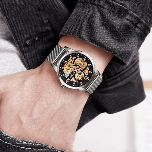 SKMEI Stainless Steel Mesh Belt Waterproof Gear Mechanical Men's Watch